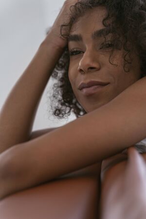 Pretty young female lying on the couch leaning on her hands