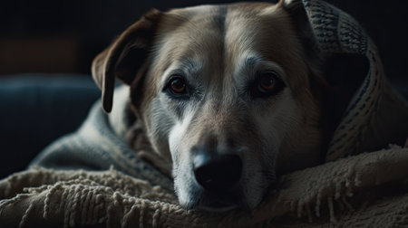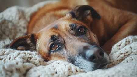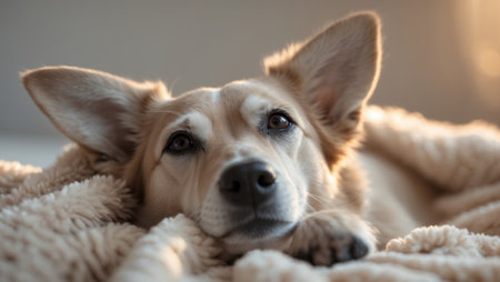 AI Generated. Adorable Dog Relaxing on Cozy Blanket with Loving Eyes