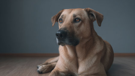 A thoughtful brown dog rests on a wooden floor against a neutral gray wall, capturing the essence of companionship and calmness, ideal for pet-related themes.