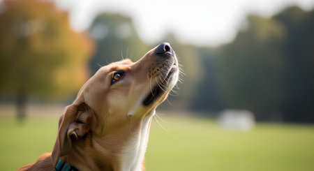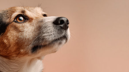 Happy dog looks upward in soft natural light with a clean pastel background, creating space for text while showing health and care.