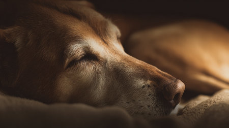 A mature dog rests comfortably in a warm space, highlighting a sense of care and the importance of premium nutrition for older pets.