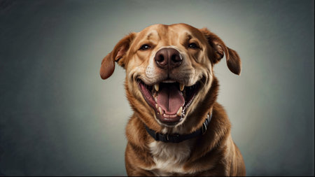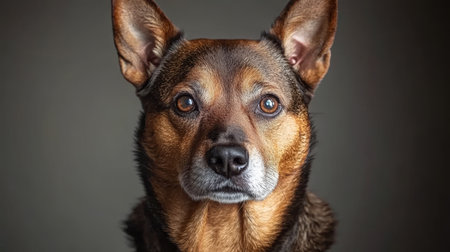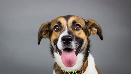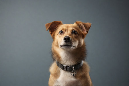 Portrait of a mixed breed dog on a gray background. Studio shot.