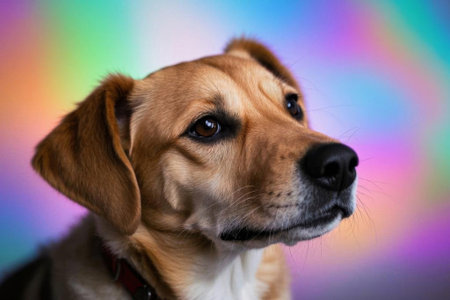 A curious puppy's face shines with a lively expression, inviting joy and warmth in a vibrant, blurred background.
