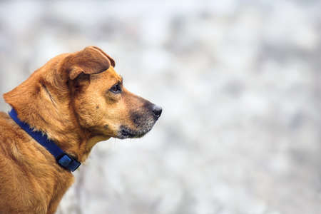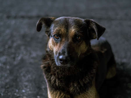 Portrait of a mixed breed dog looking at the camera with a sad expression