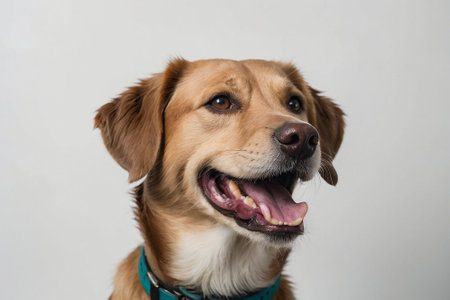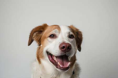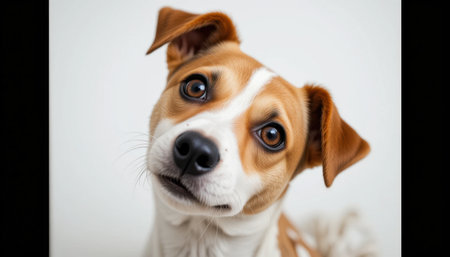 A detailed shot of a dog with a distinctive and adorable expression, such as a tilt of the head or a playful grin, against a clean background.