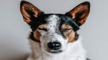 A close-up shot of a dog with its eyes closed, showing its distinctive markings and alert ears.