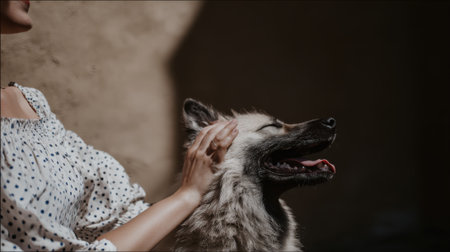 A woman gently pets her dog outdoors, bathed in warm sunlight.