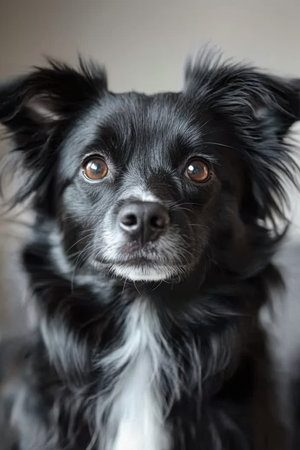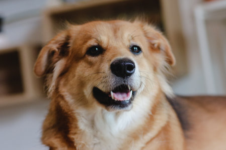 High-resolution close-up of a dog with a sweet, gentle face, featuring its unique fur pattern and playful personality in a cozy setting.
