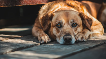 Sad dog lying on the wooden floor in the garden. Selective focus.