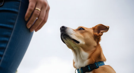 A well-behaved tan dog with a blue collar looks up with full attention at its owner, whose hand is partially visible. The scene captures a moment of training, obedience, and the strong bond between a human and their pet.