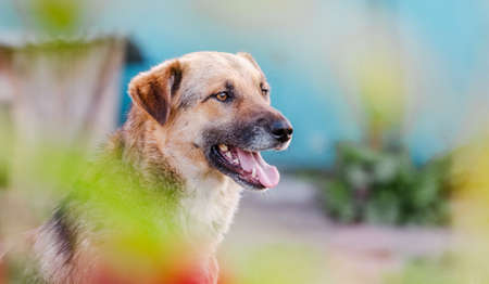 Cute greek shepherd dog looking at the cammera. White and brown color, animal nose and mouth closeup view, blur background. Friendly happy domestic pet