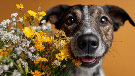 A close-up image of a joyful dog surrounded by vibrant wildflowers against an orange background, showcasing the beauty of nature and friendship.