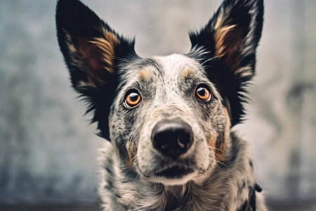 Portrait of a mixed breed dog with an orange eyes on a gray background