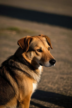 Dog - sad, lying on the gray asphalt road during the day, brown and orange coloring, mongrel pets