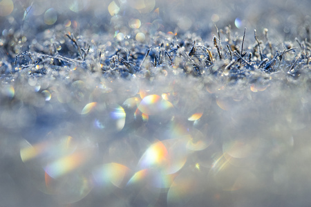 Close up of ice crystals showing their intricate structure on a frosty winter day with beautiful bokeh light shining through them