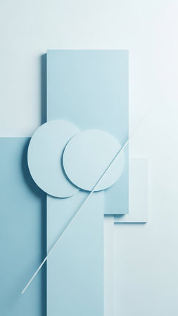 A minimalist abstract composition overlapping pastel blue geometric shapes including circles rectangles and a thin diagonal line on white.