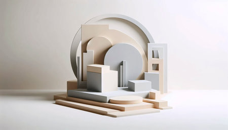 A minimalist arrangement of soft pastel spheres, cylinders, and blocks on a smooth gradient background, showcasing...