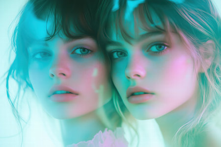 Portrait of two beautiful girls in pink and blue light. Studio shot.