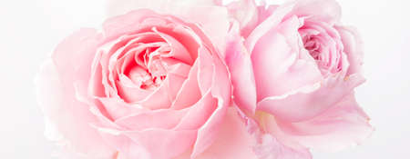 Romantic banner, delicate white roses flowers close-up. Fragrant crem pink petals