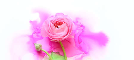 Creative image of beautiful pink Buttercup flower on artistic ink background. Top view with copy space