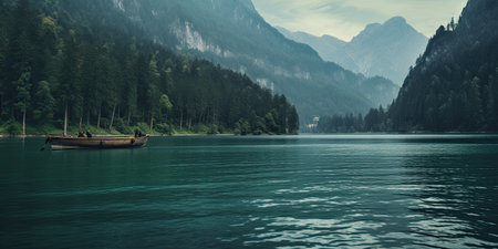 Rustic lake, boat, lake wallpaper, lake water, Mediterranean lake in the style of calming and introspective aesthetic, dark green and light aquamarine, swiss style