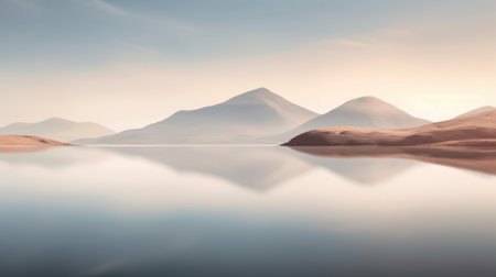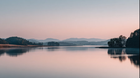 Captivating scene showcasing a serene sunrise over a calm lake, surrounded by majestic mountains and soft mist. Perfect for conveying tranquility and natural beauty.