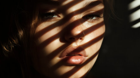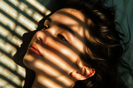 A woman stands in a sunlit room, her profile illuminated by soft light. Stripes of shadow created by blinds dance across her face, adding depth to the serene scene.