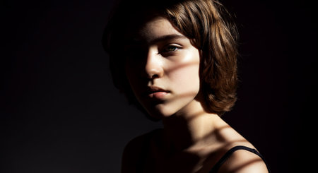 Close up portrait of young woman with short dark hair and freckles, showcasing her expressive eyes and soft lips. lighting creates dramatic effect, enhancing her features