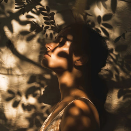 A serene young woman stars thoughtfully into the distance, her features softly highlighted by intricate shadows from nearby foliage. The tranquil atmosphere invites reflection and calmness.