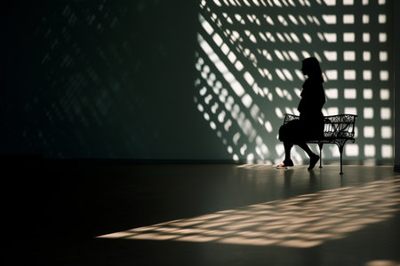 Silhouette of a person with light patterns against a dark background creating dramatic shadows in a dimly lit space