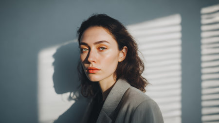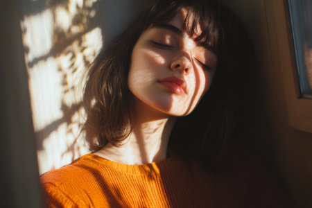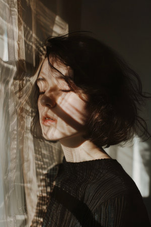 A serene young woman with short dark hair and natural makeup, illuminated by soft sunlight, casting beautiful shadows on her face, embodying calmness and beauty