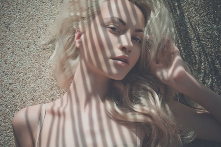 Shadow Plays on a woman's face, creating abstract patterns in a room lit by diffused daylight. Fashion magazine portrait