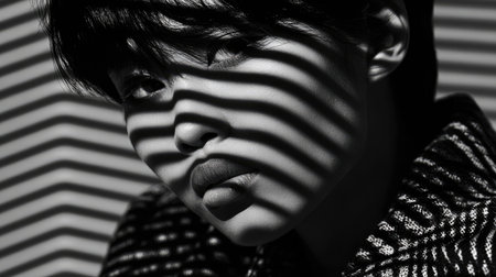 A mesmerizing black and white portrait featuring a woman's face illuminated through intricate patterns of shadows, showcasing the beauty of light and texture.