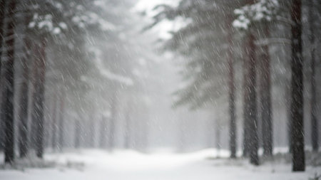 Snow-covered forest with tall trees and falling snowflakes