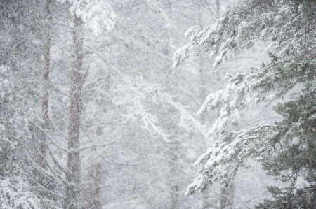 Winter wonderland snowcovered trees and branches in a forest during a fierce winter storm