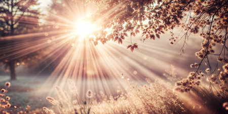 Sunbeams breaking through the branches of an autumn tree, illuminating the meadow below.