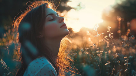 A young woman basks in the warmth of setting sun eyes closed savoring tranquility of nature.