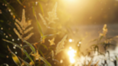 Golden sunlight illuminates tall grass swaying gently in a peaceful meadow during late afternoon creating a calm and warm atmosphere.