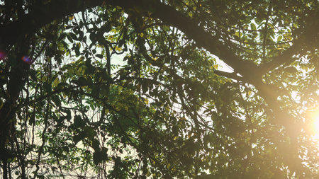 Bright sunlight filters through lush green leaves in a vibrant outdoor setting during late afternoon