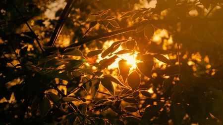 Nature background with silhouette of foliage. Sunset light, sun lens flares, golden hour