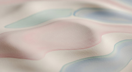 A detailed macro shot reveals a textured fabric surface with flowing, organic abstract shapes in delicate pastel shades of pink, blue, and green.