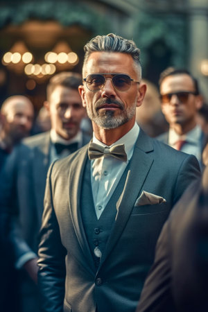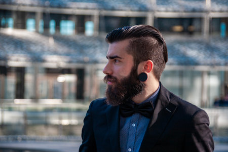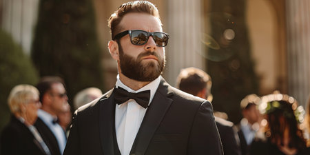 handsome bearded man in sunglasses and tuxedo walking on street
