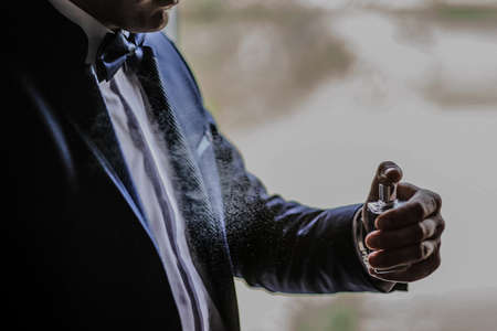 Close up of young man groom use perfume with visible drops