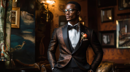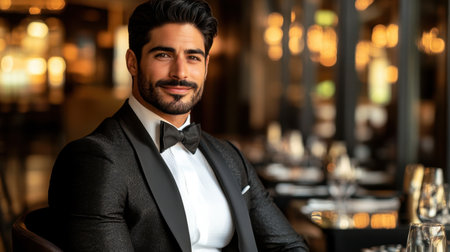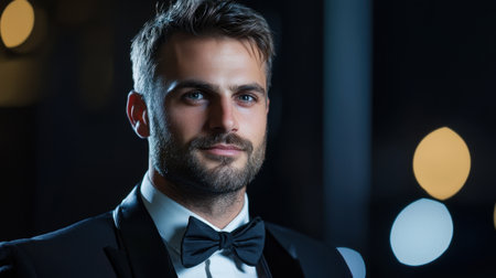 Smartly dressed man in a tuxedo exudes confidence at an elegant social event with a softly lit background.