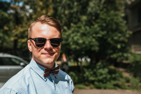 Portrait of a handsome young blond in sunglasses in a park in the city. copy space