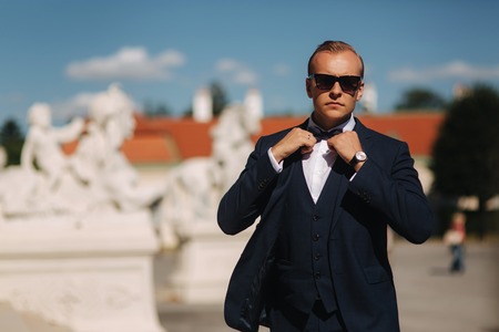 Fashion man in stylish blue suit and tie bow. He also wears sunglasses and and luxury watch
