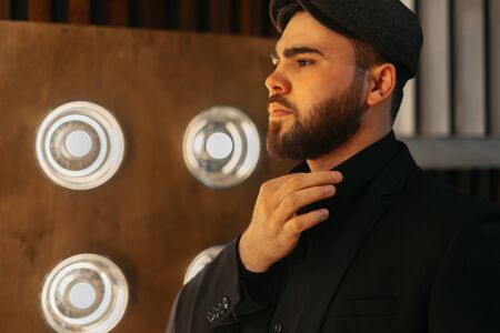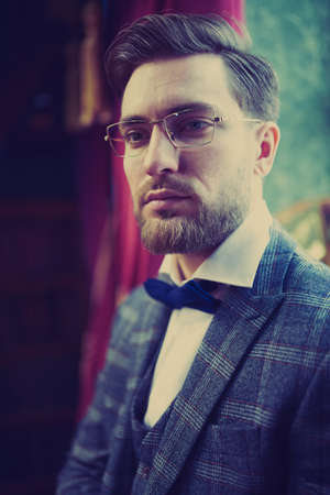 handsome young bearded man in a tuxedo sitting in dark room in fashionable clothing for the festive evening