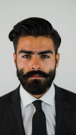A man with a beard and a mustache is wearing a suit and a white shirt. He has a serious expression on his face