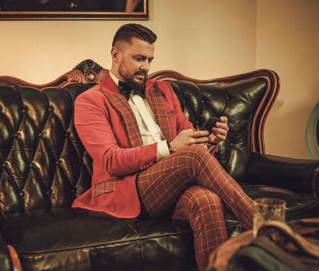 Extravagant stylish man sitting on classic leather sofa in gentleman club.