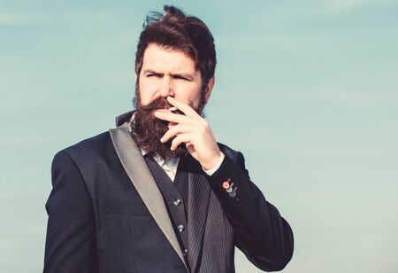 Cigarettes help us with everything from boredom to anger management. Man with beard mustache hold cigarette. Bearded hipster smoking cigarette sky background. Guy cigarette enjoy nicotine influence
